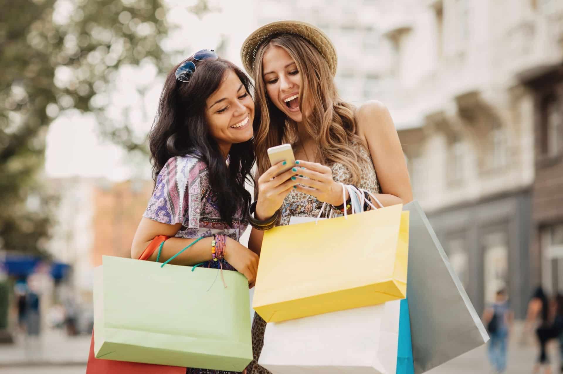 woman shopping and smiling with phone in hand